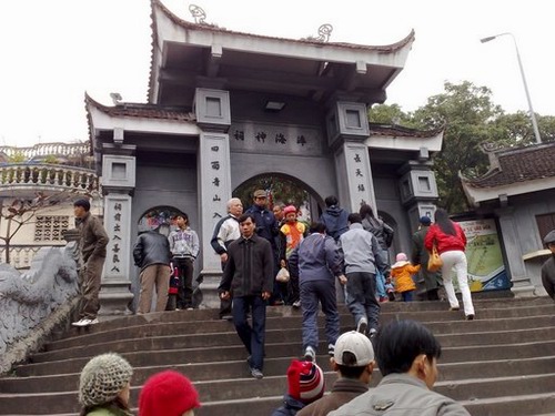 Quang Ninh province. The temple was built at the beginning of the 19th century, and included three main areas: the lower temple (Den Ha), the middle temple (Den Trung) and the upper temple (Den Thuong). In the lower temple, people observe the cult of the mother (Mau), while the upper temple is sacred to the cult of Tran Quoc Tang. Formerly, in the main temple, people observed the worship of Hoang Cau, a regional hero, but it was later changed to honour the third son of Tran Hung Dao, who was very heroic in the defence of the border in the Cua Suot area. .