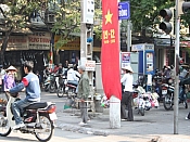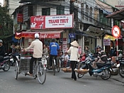 The alley now ends and I have to turn left onto Doi Can, a busy road at all times of day. The moment this peak hour rush subsides, the school down the road will break for lunch, and the commuters will be replaced by laughing school kids walking and cycling home for their mum?s home-cooked lunch. Teenagers will double their friends on their bicycles, their handle bars wobbling as they attempt to steady their bike and negotiate the traffic with their mate sitting uncomfortably on the back. Most of the school kids are too young to get on a motorbike just yet, but of course there is always a few who are either of-age or riding illegally, with at least 3, but usually 4 or 5 teens squeezed on the motorbike seat. There will be a small Vietnamese girl driving the bike, her long, shiny black hair blowing in the wind behind her and into her friends? faces as they drive. The really small children will wait to be picked up by mum, deftly climbing up on the seat behind her when they spot her, and holding on tight as she whizzes her child home.